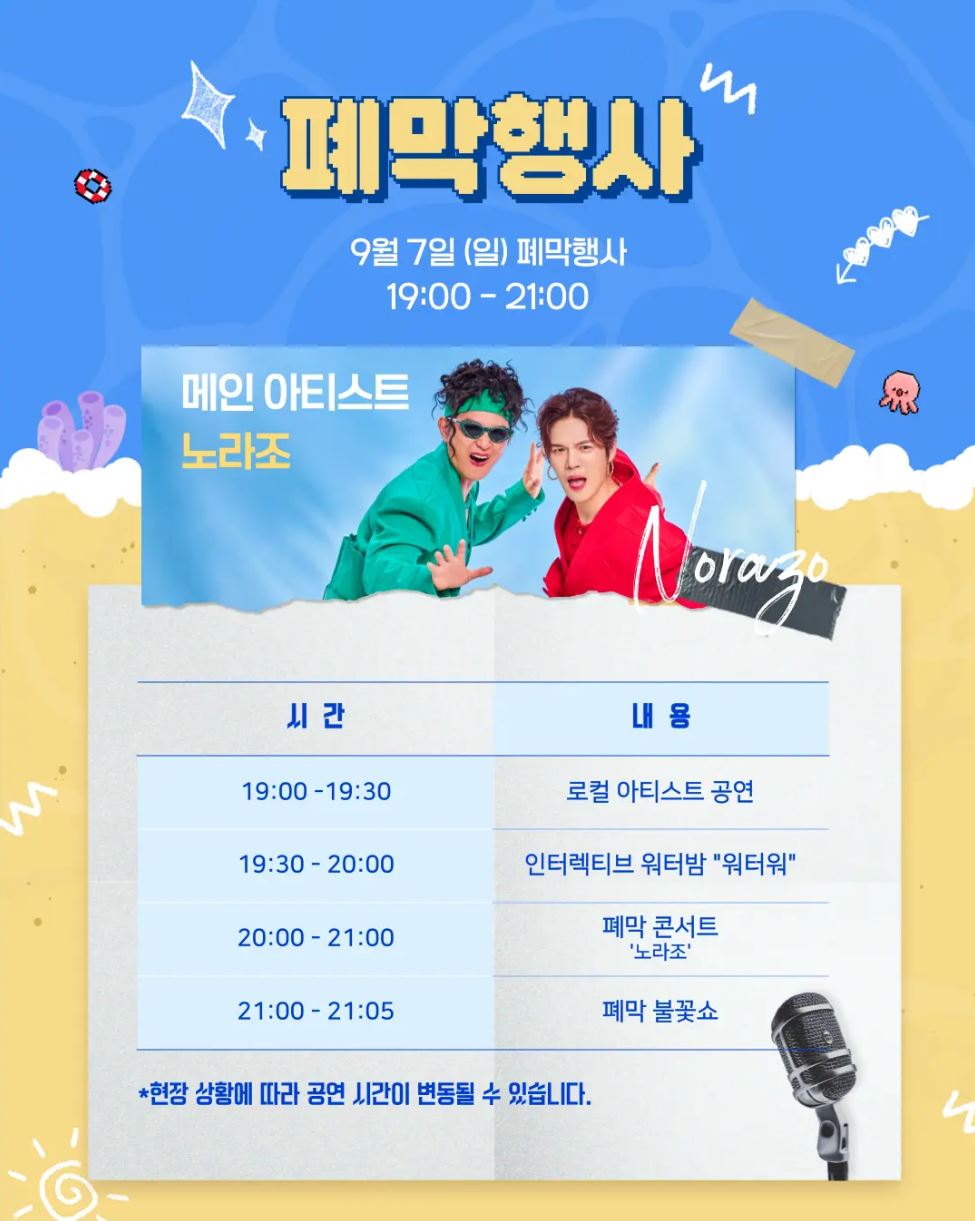 - 20:00 - 21:00: 폐막 콘서트 '노라조'