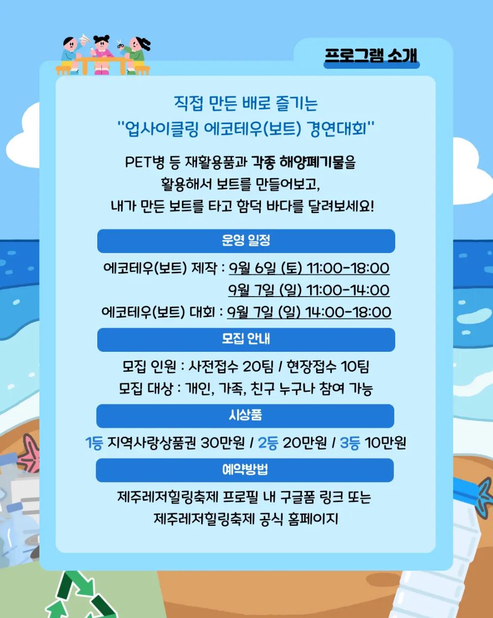 - 예약 방법: 제주레저힐링축제 프로필 내 구글폼 링크 또는 공식 홈페이지