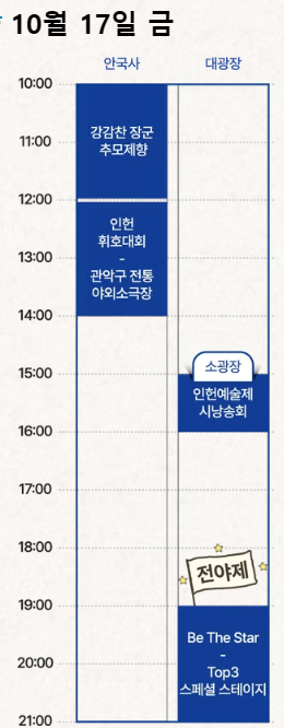 - 📅 10월 17일(금) — 강감찬 장군 추모제향, 비더스타(싱어송라이터 신예발굴 콘서트)