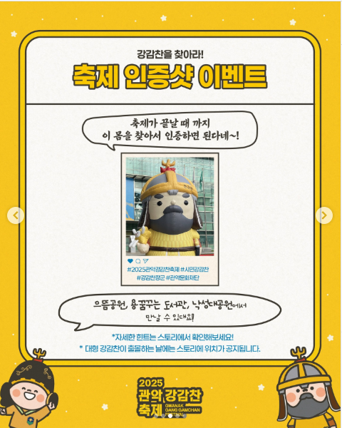 서울시 유일의 예비문화관광축제로 선정된 관악강감찬축제가 오는 2025년 10월 17일(금)~19일(일), 낙성대공원 일원에서 개최됩니다.