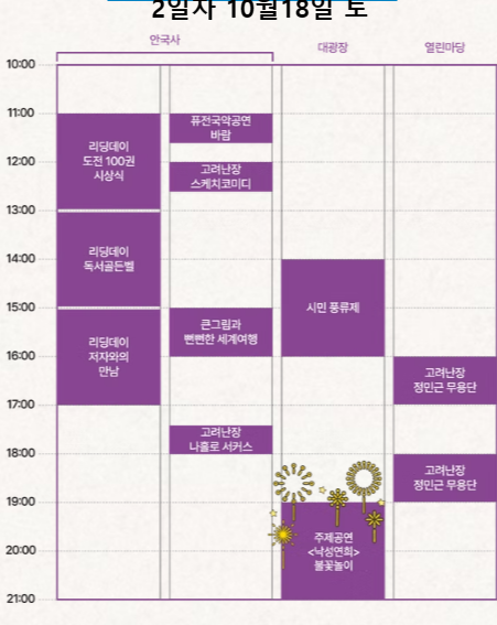 | 주제공연 〈낙성연희〉 | 대광장 | 10.18(토) 19:00~21:00 | 강감찬 장군의 일생을 예술로 표현한 대형 야외공연 |
