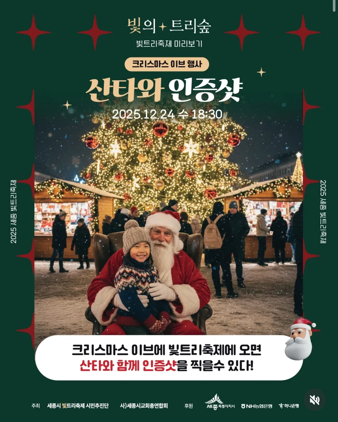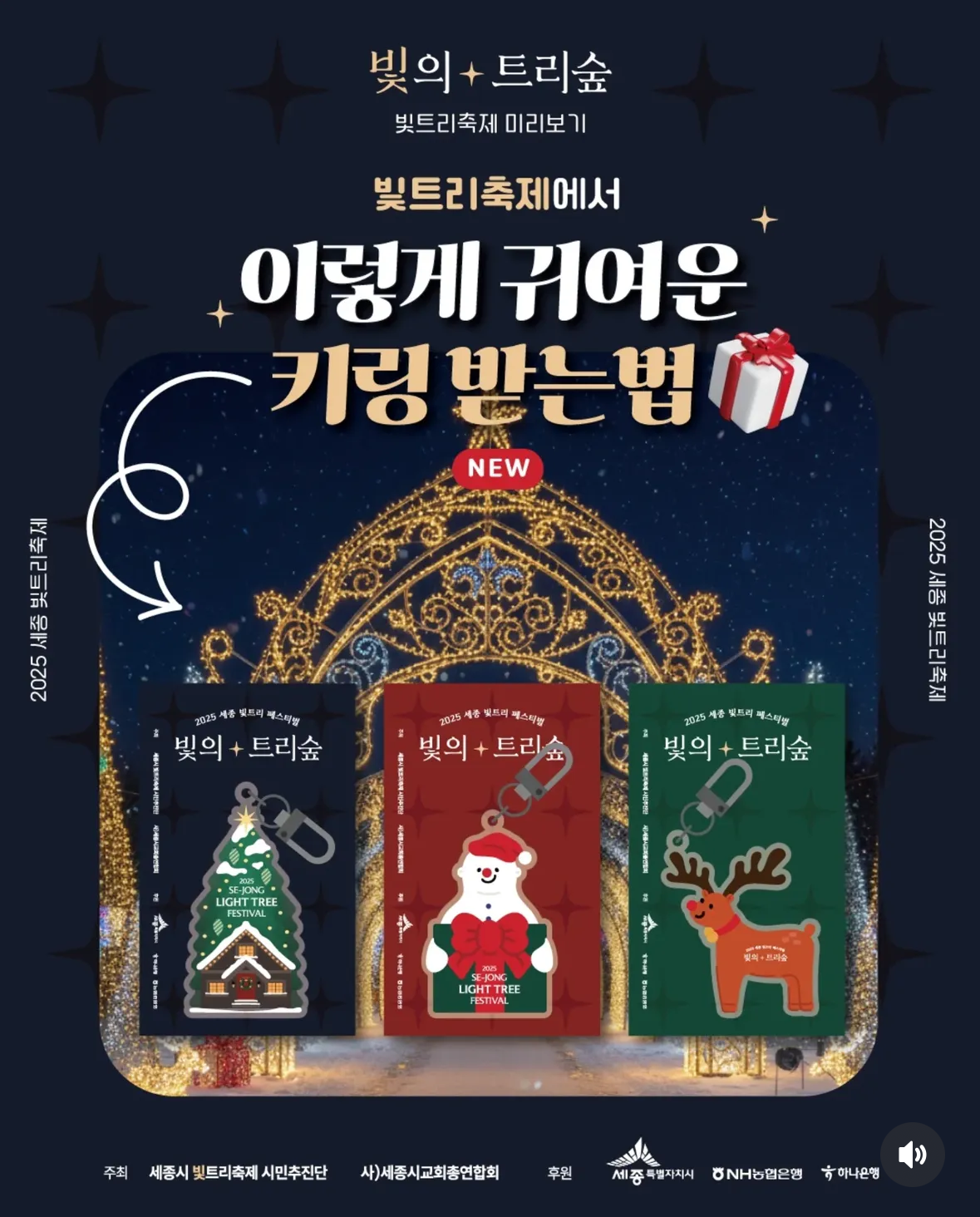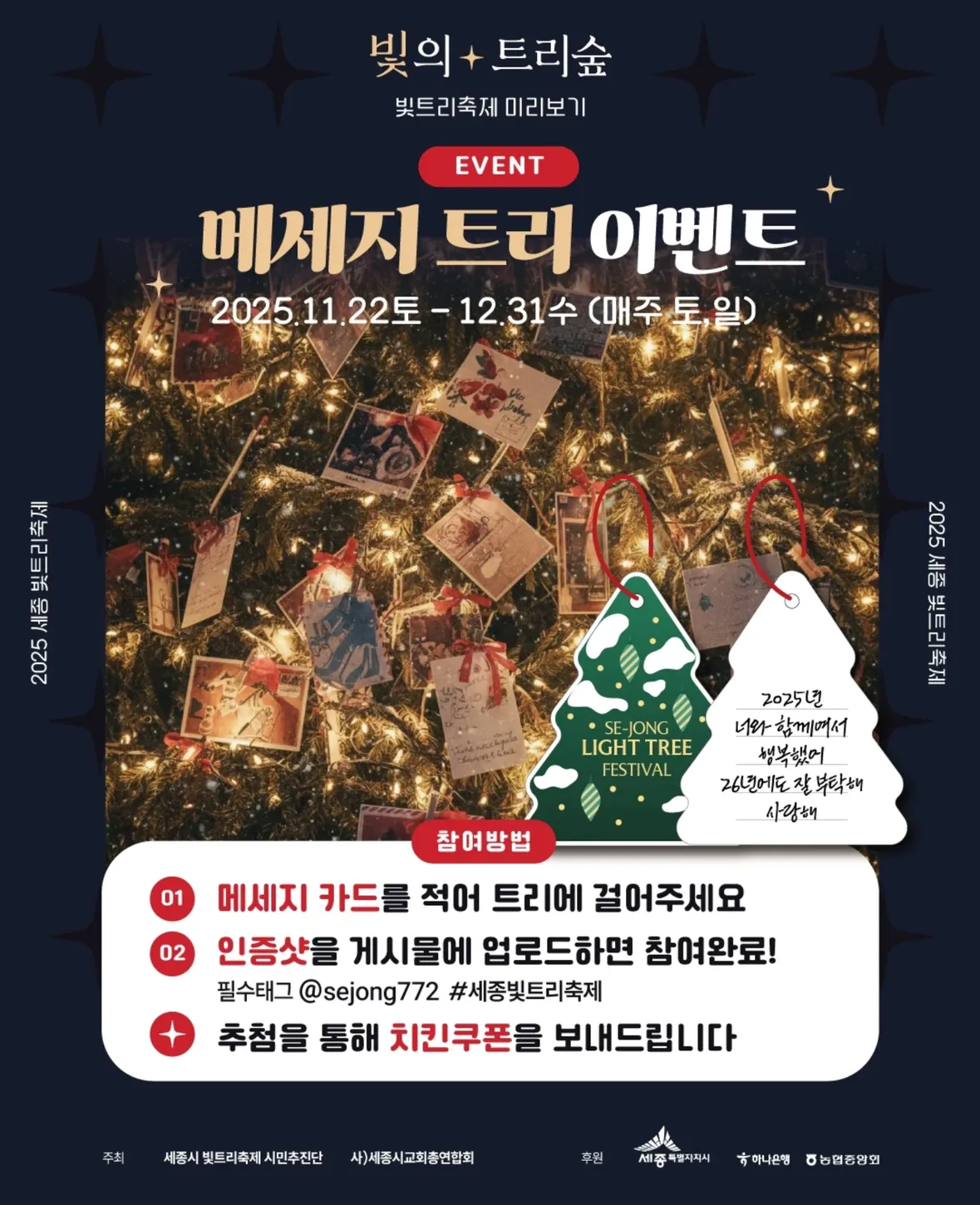 | 참여방법 | ① 메시지 카드를 트리에 걸기 ② 인증샷을 인스타에 업로드 (필수 해시태그: #세종빛트리축제 @sejong772 ) ③ 추첨 통해 치킨 쿠폰 증정 |
