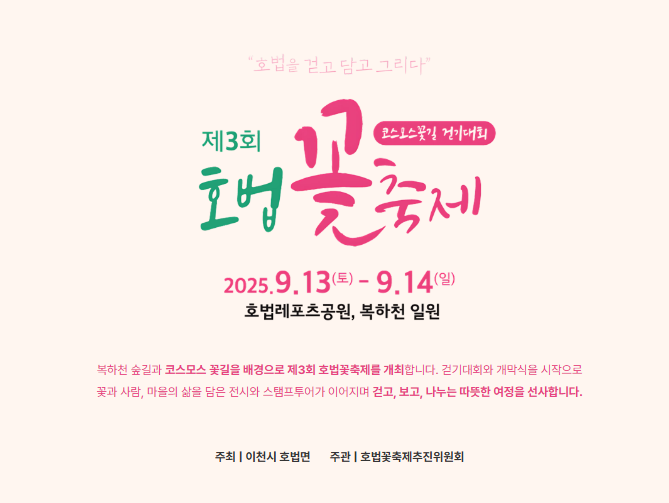「제3회 호법꽃축제」는 2025년 9월 13일(토)~14일(일) 양일간, 호법레포츠공원과 북하천 일원에서 개최됩니다.
