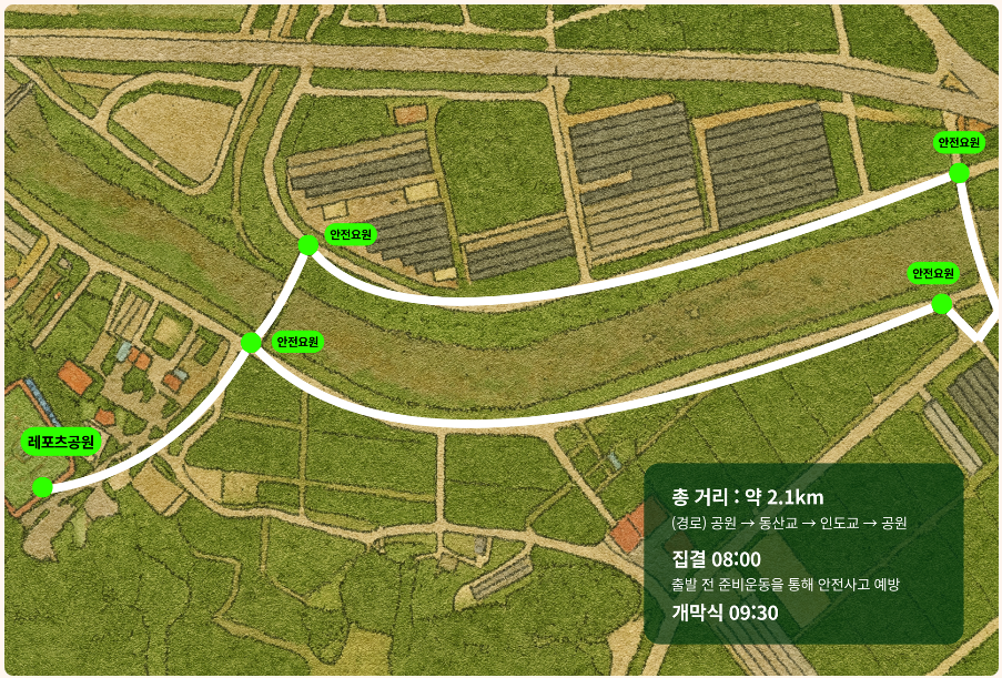 - 코스: 레포츠공원 ~ 둔치교 ~ 인도교 ~ 공원 (총 거리 약 2.1km)