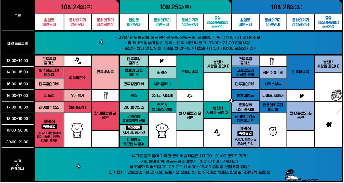 이색경연대회 | 10.24~10.26 (15:00~16:00) | 만두 빨리 빚기, 램덤플레이댄스, 왕만두 탑쌓기 경연대회 등 |