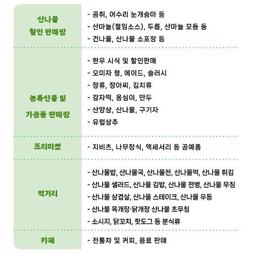 | 슬로건 | 태백 산나물이 제공하는 자연의 맛과 향기에 취해보자! |