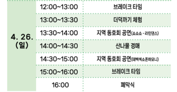 | 산나물 노래자랑 | 현장접수 선착순 10명! 4/25 16:00~17:00 |