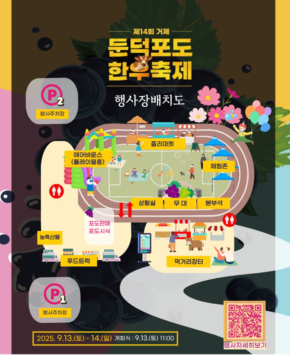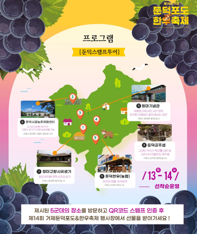 🍇 거제둔덕포도&한우축제는 가족 단위 방문객들에게 가을의 정취와 함께 다양한 체험활동을 제공하는 거제도의 대표적인 가을축제입니다. 달콤한 포도와 맛있는 한우, 그리고 다양한 볼거리가 준비된 이번 축제에 많은 관심과 참여 부탁드립니다!