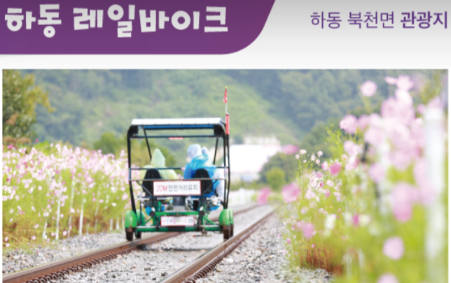 - 하동 레일바이크 — 북천역에서 양보역까지 5.2km의 레일 위를 달리는 체험. 사계절 꽃향기를 맡으며 코스모스 축제장을 지나갑니다. 1일 6회 운행. (주소: 하동군 북천면 이명골길 14-28, 문의 055-882-2244)