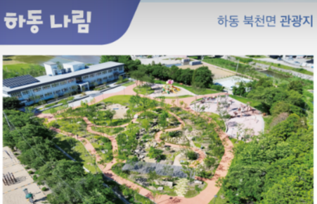 - 하동 나림 — ‘지리산의 어떤 숲’이라는 테마로 계곡생태숲, 지리산 야초원, 이끼자수원 등 다양한 조경과 생태를 즐길 수 있는 생태 공원. (주소: 하동군 북천면 세이리길 14, 문의 055-880-2578)