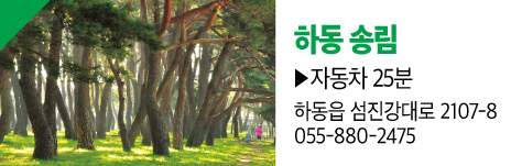 - 하동 송림 — 260여 년 세월을 간직한 노송과 맑은 섬진강물, 백사장이 어우러진 ‘백사청송’의 고장. 천연기념물 제445호. (주소: 하동읍 섬진강대로 2107-8, 문의 055-880-2475)