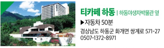 - 티카페 하동 — 하동야생차박물관 옆에 위치한 차 카페. 전통 야생차를 기본으로 한 다양한 음료와 디저트를 즐길 수 있다. (주소: 하동군 화개면 쌍계로 571-27, 문의 0507-1372-8971)