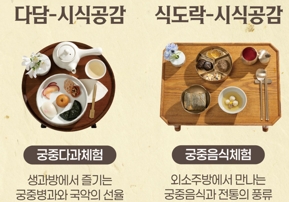 국악 연주를 감상하며 생과방에서 왕과 왕비가 즐기던 궁중 다과와 약차를 체험합니다.