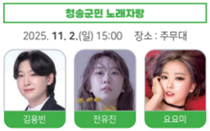 | 11.02(일) | 청송군민 노래자랑 (김용빈, 전유진, 요요미 출연) |