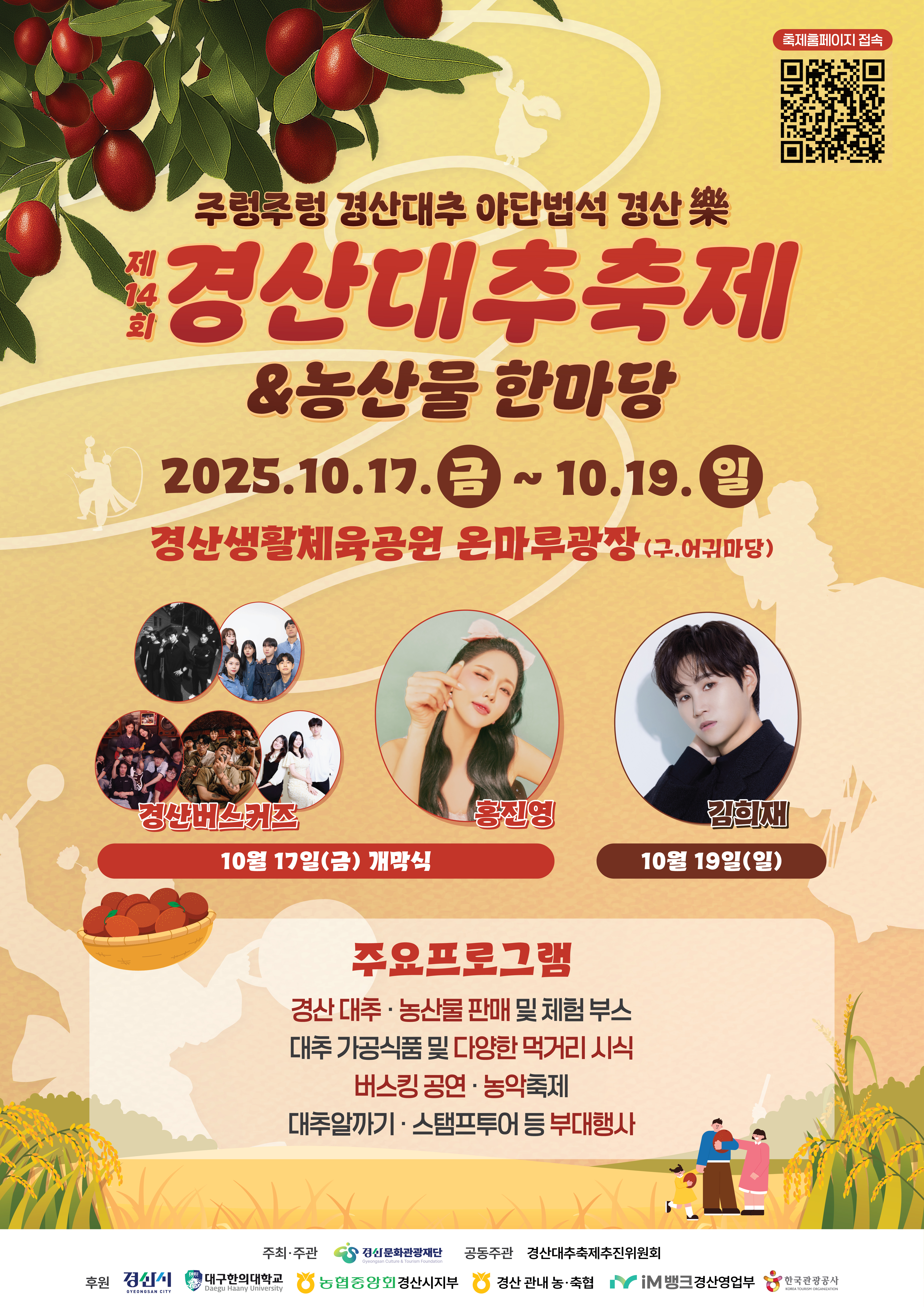 | 제14회 경산대추축제 & 농산물 한마당 | 2025.10.17(금) ~ 10.19(일) | 경산생활체육공원 온마루광장 (구 어귀마당) | (재)경산문화관광재단 / 경산대추축제추진위원회 |
