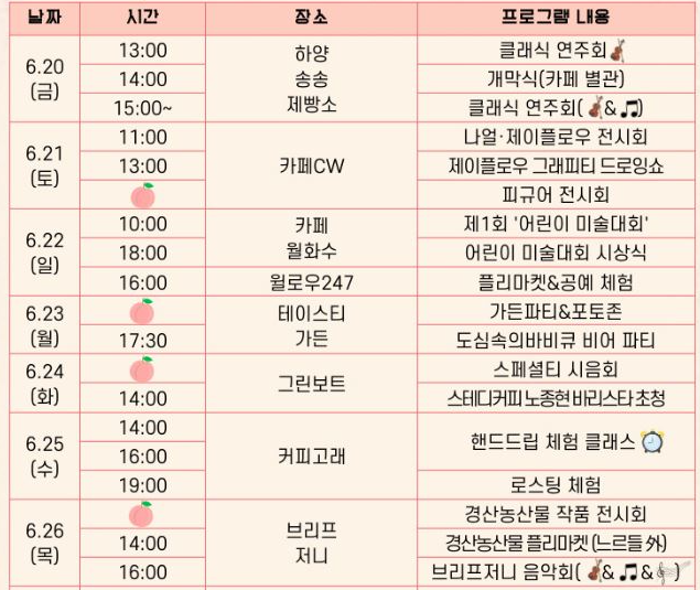 전국 최고 품질을 자랑하는 경산 신비복숭아가 제철을 맞이하는 6월, 경산의 대표 특산품인 신비복숭아와 함께하는 특별한 콘셉트로 진행되어, 경산 지역의 여러 카페에서 신비복숭아를 활용한 음료 및 디저트로 더욱 풍성하고 달콤한 축제를 만나볼 수 있습니다.