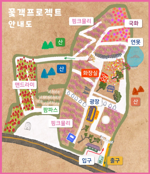 - 포토존: 핑크뮬리, 국화, 백일홍, 천일홍 등 계절별 꽃 정원