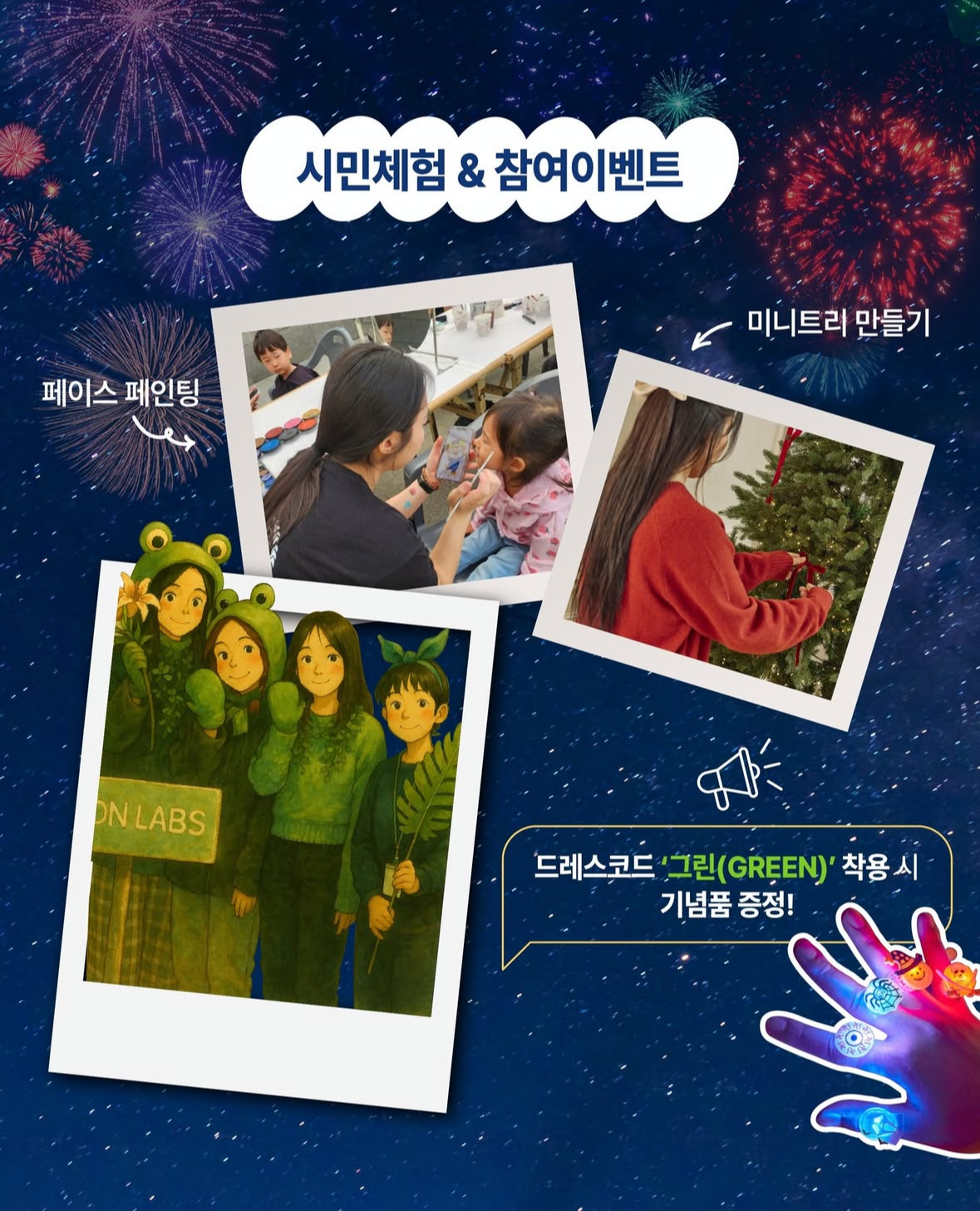 | 체험존 (무료) | 16:00 ~ 21:00 | 야광 페이스페인팅, 헤어파츠, 미니트리 만들기 |