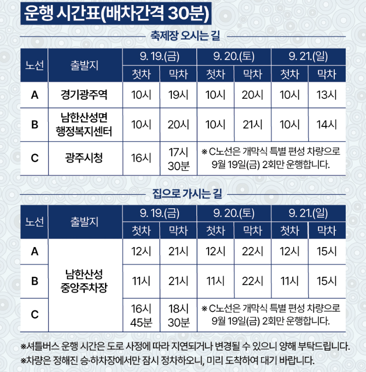 - 축제 기간 9.19(금) ~ 9.21(일) 3일 동안 셔틀버스 무료 운영