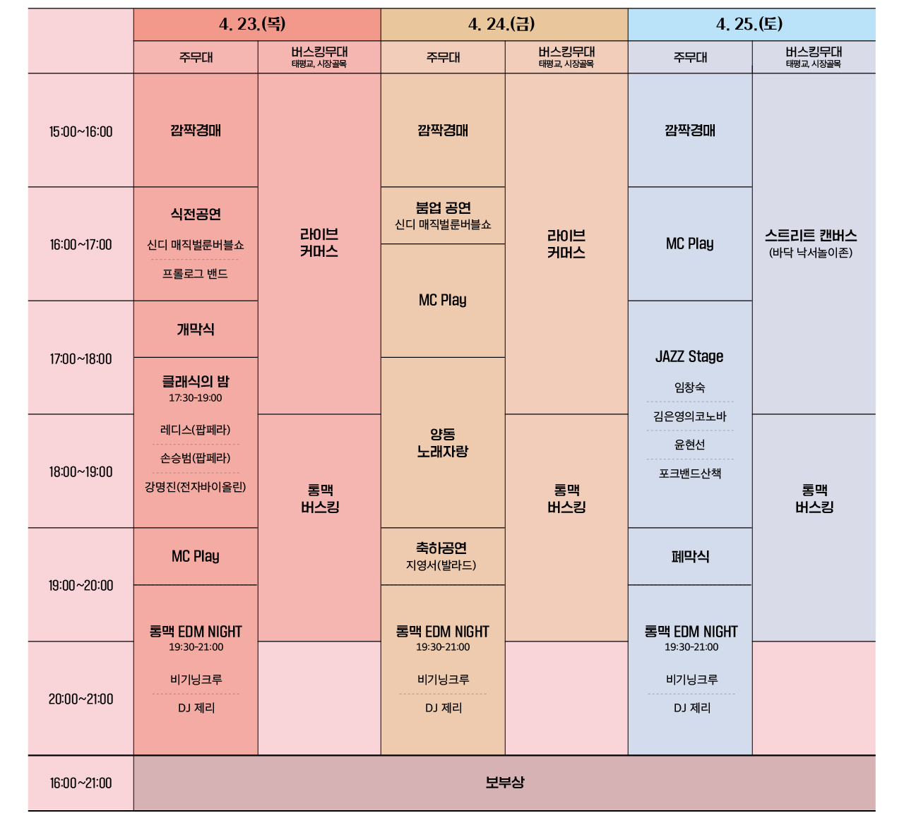 | 레크레이션 | 4/23 19:00~19:30 | 주무대 | 사회자와 함께하는 맨손 레크레이션 |