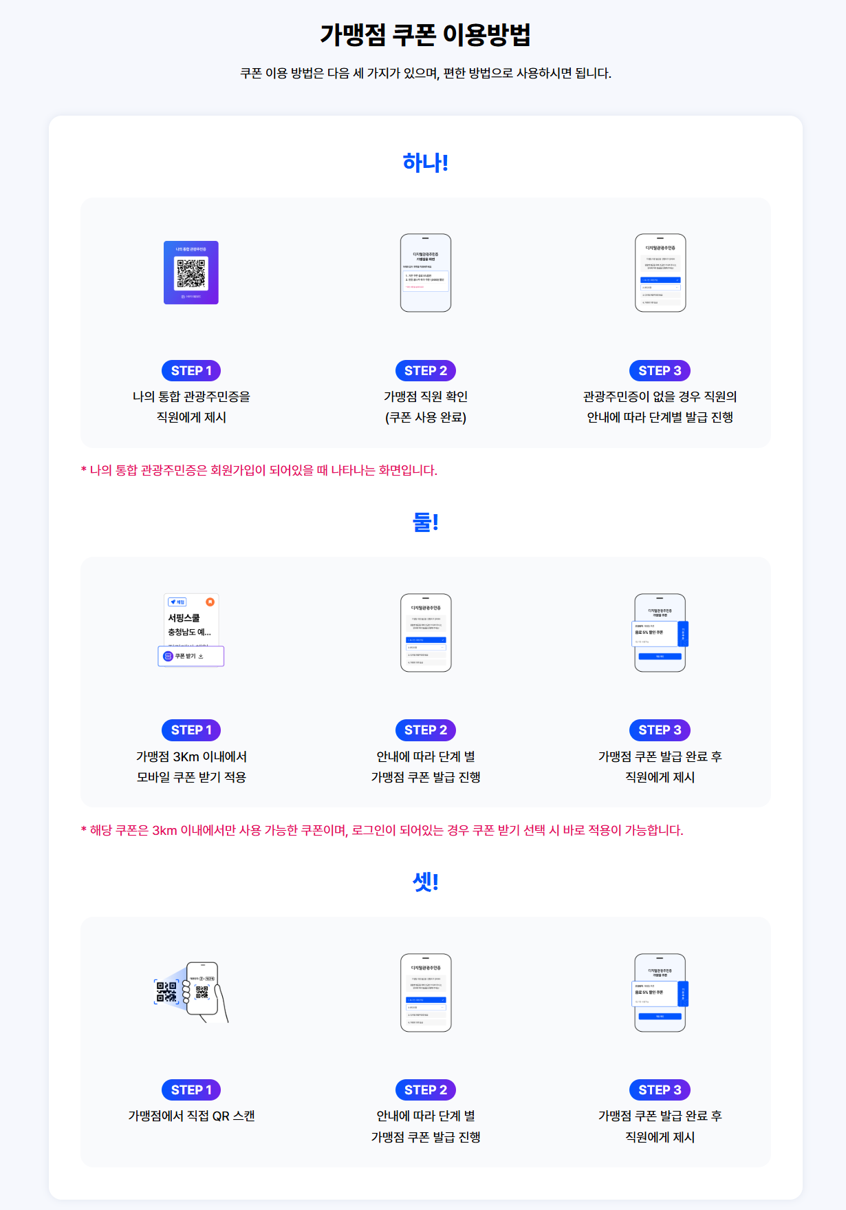 - QR 코드 스캔 : 해당 지역의 관광 안내소나 지정된 장소에서 QR 코드를 스캔합니다.