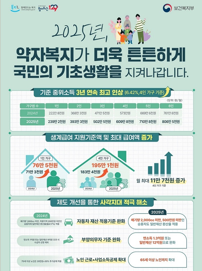 2025년에는 기초생활수급자의 자격 기준과 지원금이 일부 변경됩니다. 특히, 소득 기준이 상향 조정되어 더 많은 가구가 지원을 받을 수 있게 됩니다. 또한, 차량 소유에 대한 기준도 완화되어, 더 많은 가구가 기초생활수급자로 인정받을 수 있습니다.