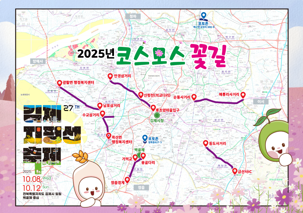 축제 기간 동안 김제 곳곳에서 가을 정취 가득한 코스모스 꽃길을 감상할 수 있습니다.