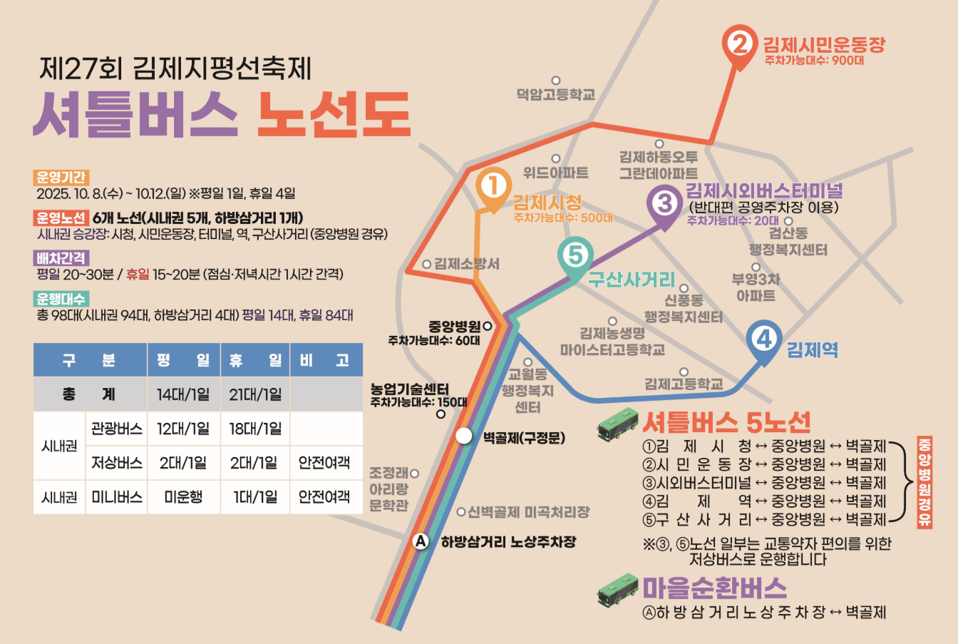 - 김제 시내 주요 지점(시청, 시민운동장, 외버스터미널, 김제역 등)에서 운영되며, 총 98대 운행 예정입니다.