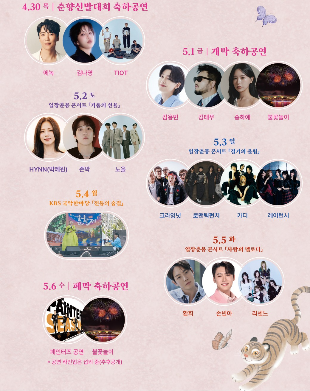 | 콘서트 | 5/2 김용빈·김태우 / 5/3 HYNN·존박·노을 / 5/6 폐막 불꽃놀이 |