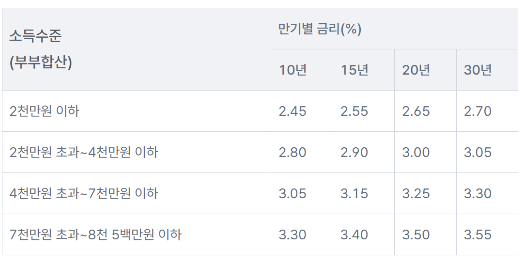 - 소득 요건 : 부부 합산 연 소득이 일정 금액 이하이어야 하며, 이 기준은 상품에 따라 다를 수 있습니다.