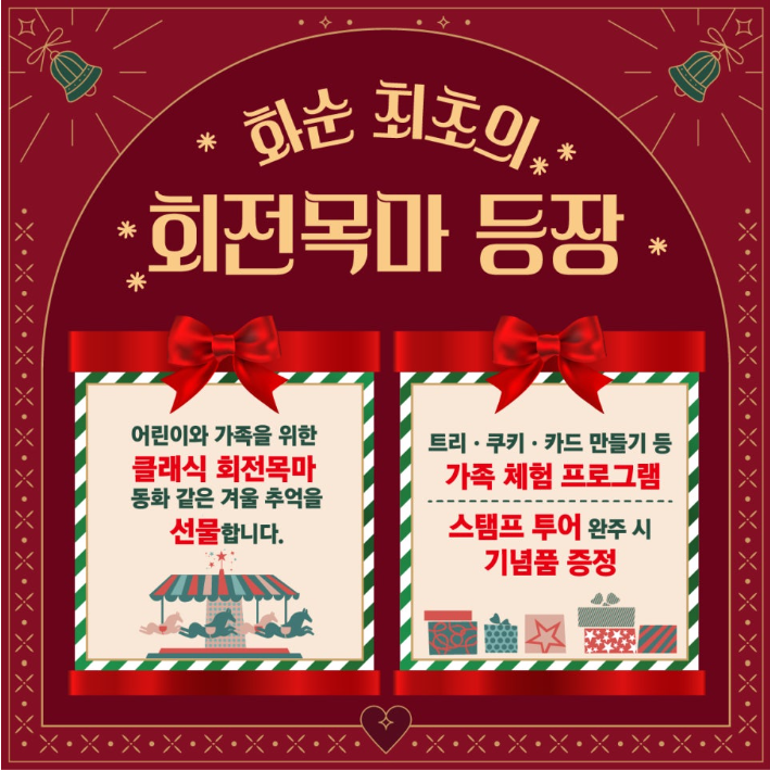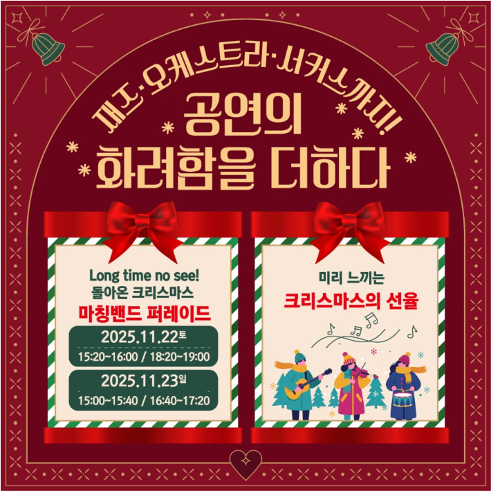 - 주요 프로그램 : ✔ 미리미리 크리스마켓 ✔ 마칭밴드 퍼레이드 공연 ✔ 크리스마스 선율 공연 ✔ 와글와글 밤시장 III ✔ 가족 체험 프로그램 & 회전목마 ✔ 트리·쿠키·카드 만들기 + 스탬프 투어