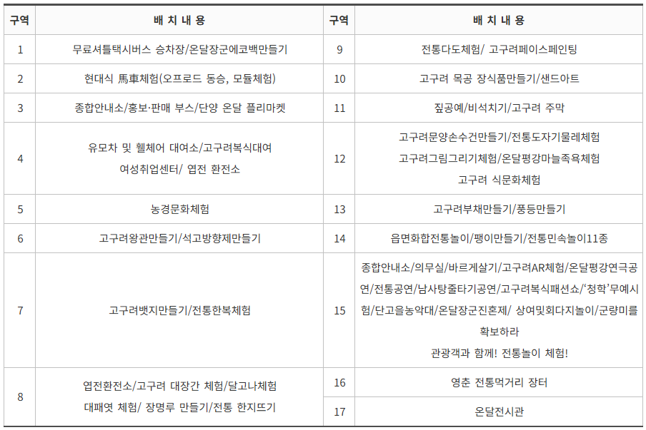 | 장소 | 영춘면 온달관광지 및 단양읍 수변특설무대 일원 |