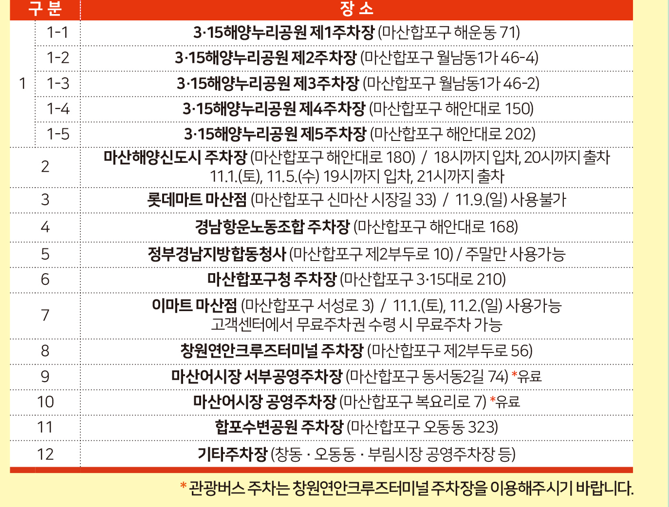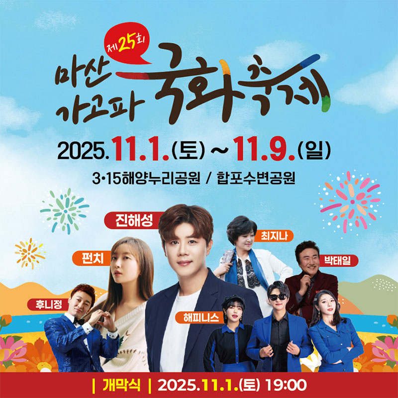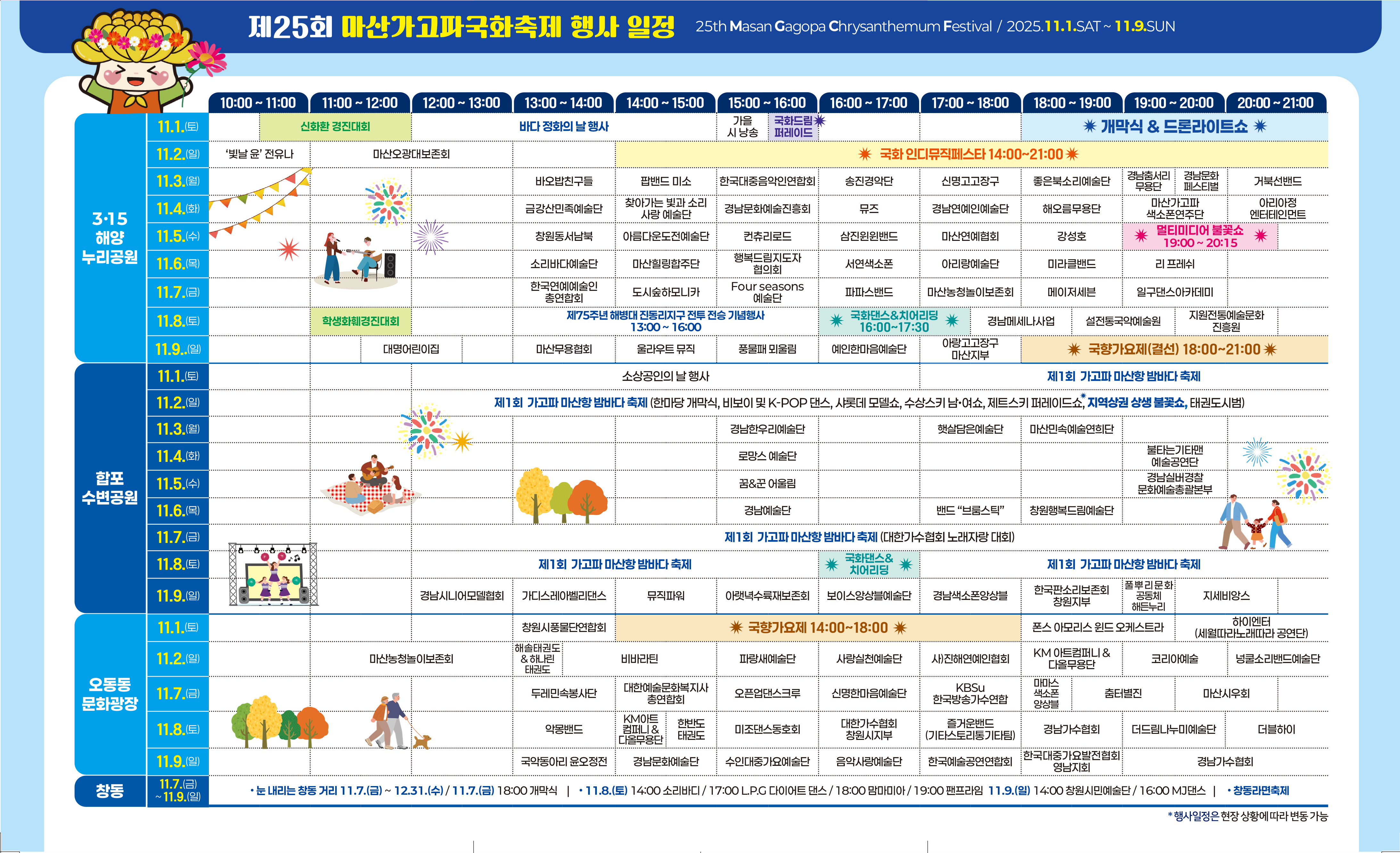 | 🌼 개막행사 | 11.1(토) 19:00 | 3·15해양누리공원 | 식전공연(18:30~), 드론라이트쇼, 축하공연(박태희·펀치·해피니스·진해성) |