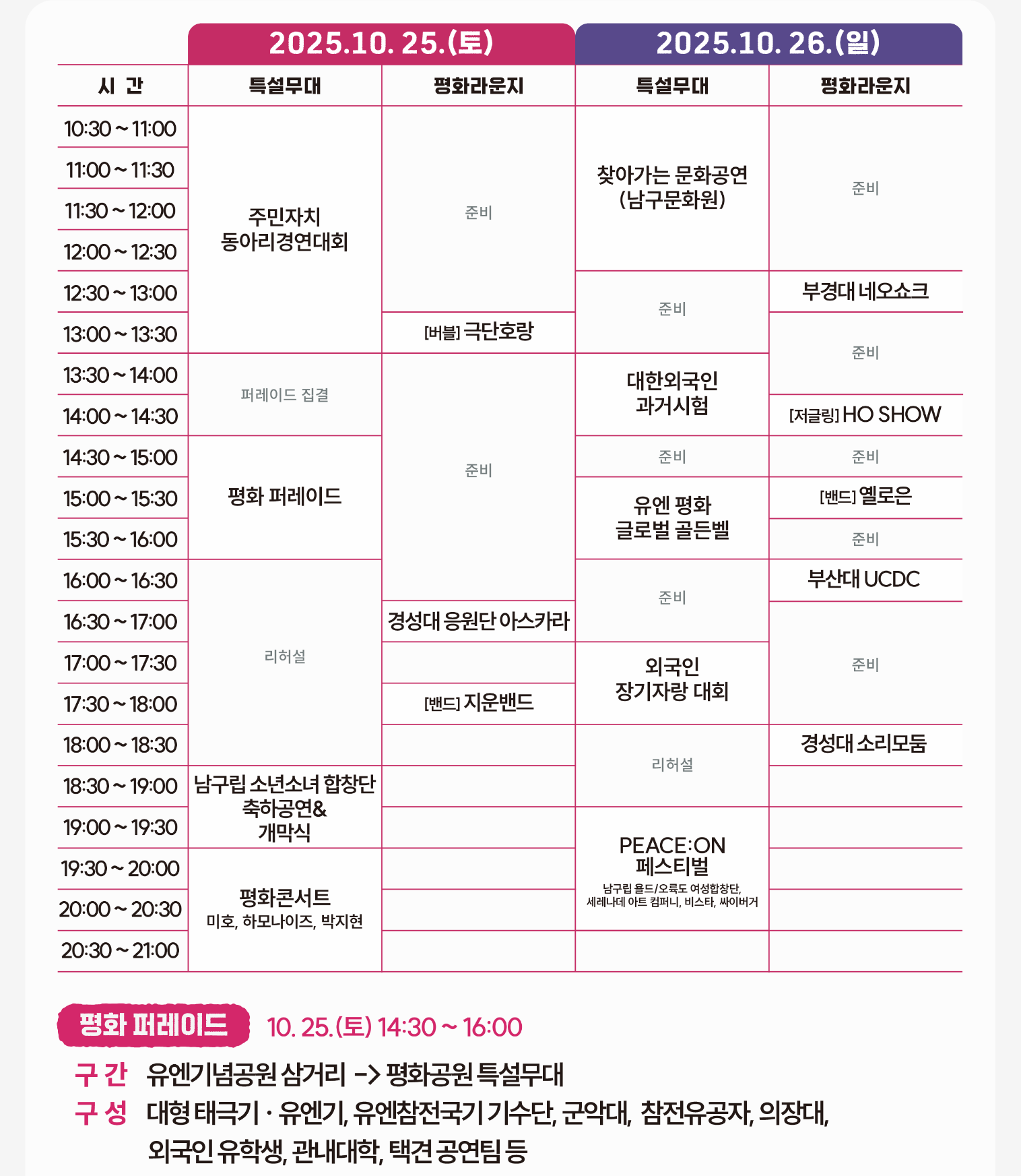 | 🕊 평화퍼레이드 | 유엔기념공원~평화공원 특설무대 / 대형 태극기, 유엔기, 군악대, 태권 공연, 외국인 유학생 행진 |