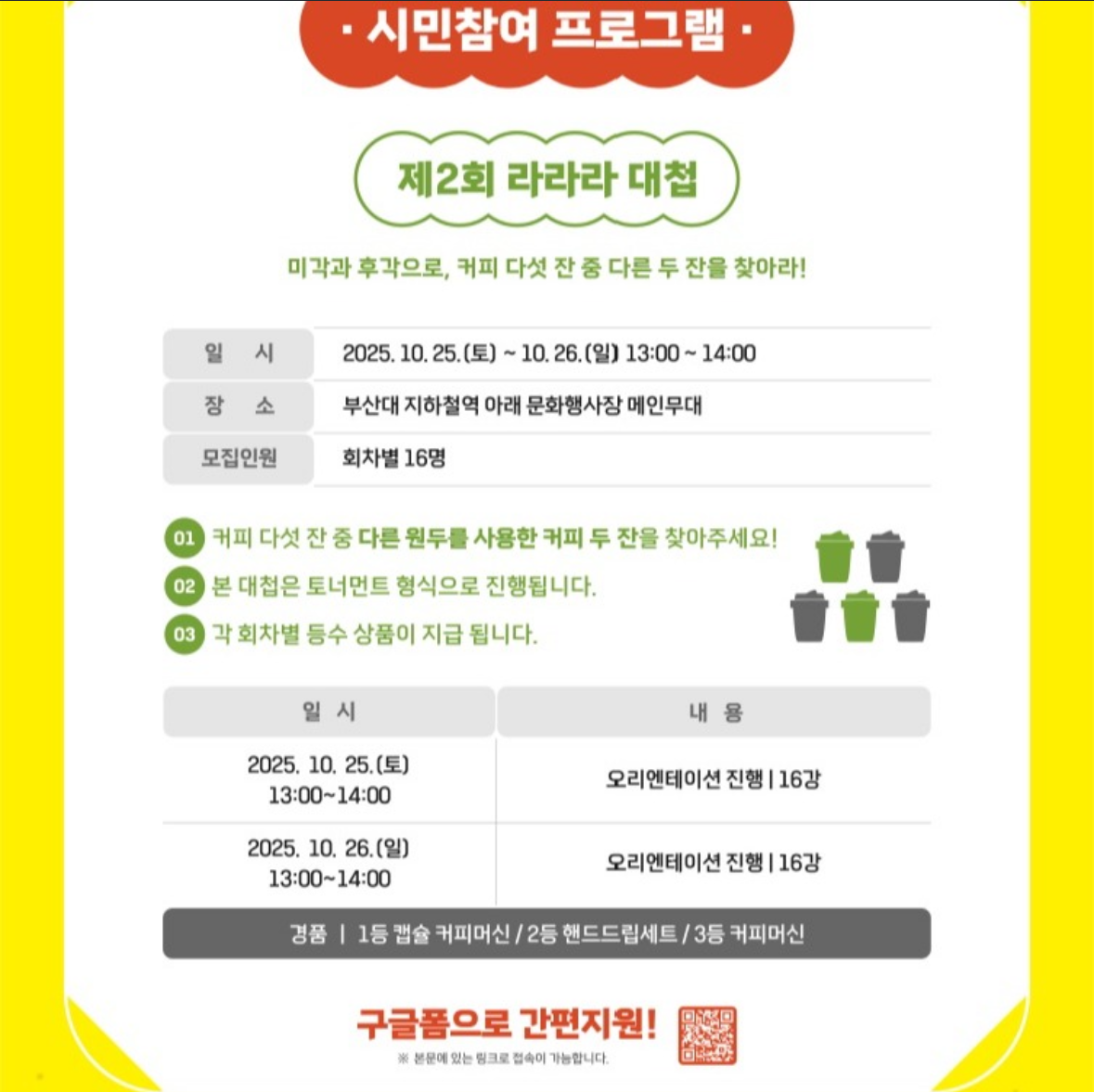 | 🎁 영수증 이벤트 | 금정구 내 식당/카페에서 2만 원 이상 구매 후 운영본부에 영수증 제시 시 드립백3종 or 수제 레몬청 증정(1일 200개 한정 3일진행) |