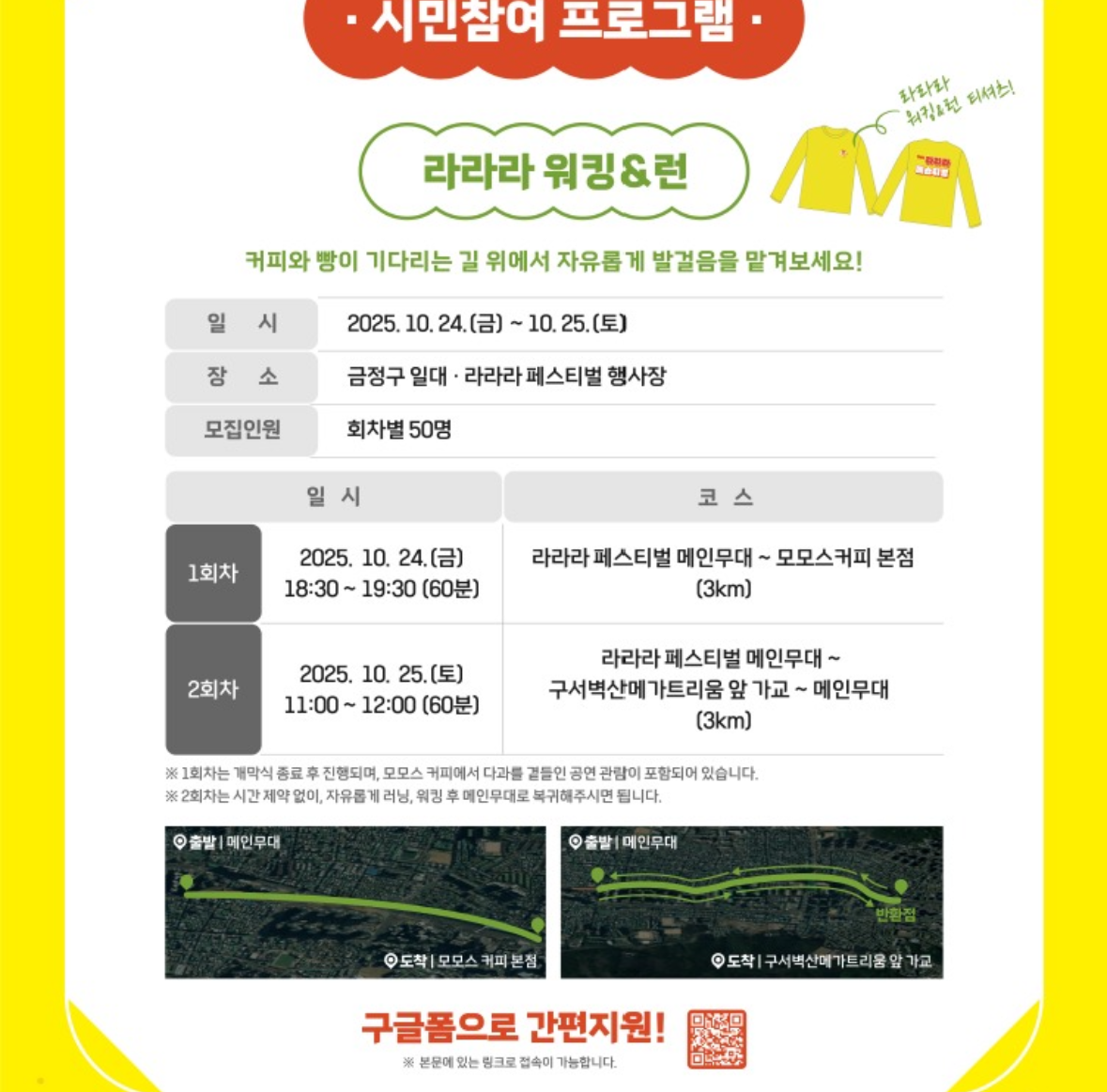 | 라라라 워킹&런 | 10.24~10.25 | 회차별 50명 | 커피와 빵 향기를 따라 걷는 3km 코스 |