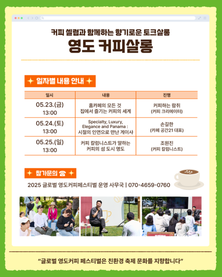 여러분의 방문을 기다리고 있겠습니다. 궁금한 사항은 공식 홈페이지(www.yeongdo.go.kr/yd_coffee_festival)를 참고해 주세요!