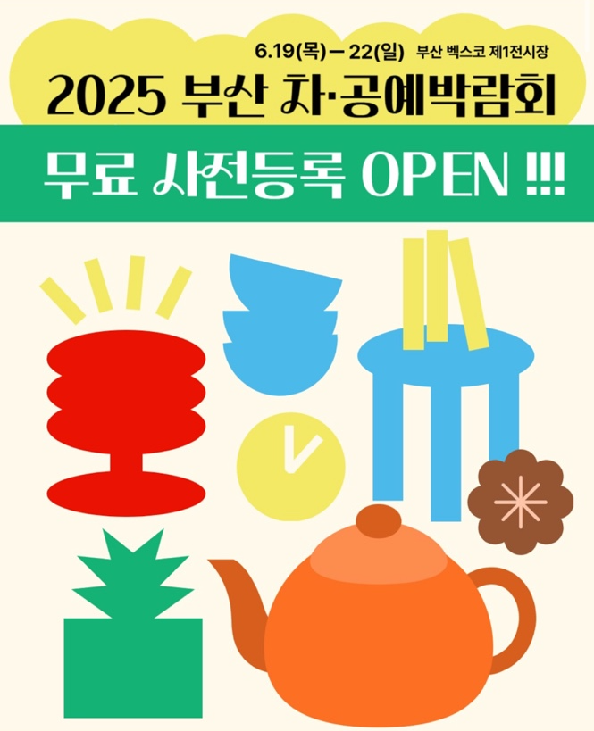 차(茶)와 공예의 아름다움을 한자리에서 경험할 수 있는 **제33회 부산 차·공예 박람회(상)**가 **2025년 6월 19일(목)부터 6월 22일(일)**까지 부산 BEXCO에서 개최됩니다. 다양한 차 문화와 공예 작품을 체험하고 구매할 수 있는 이번 박람회에 많은 관심과 참여 바랍니다.