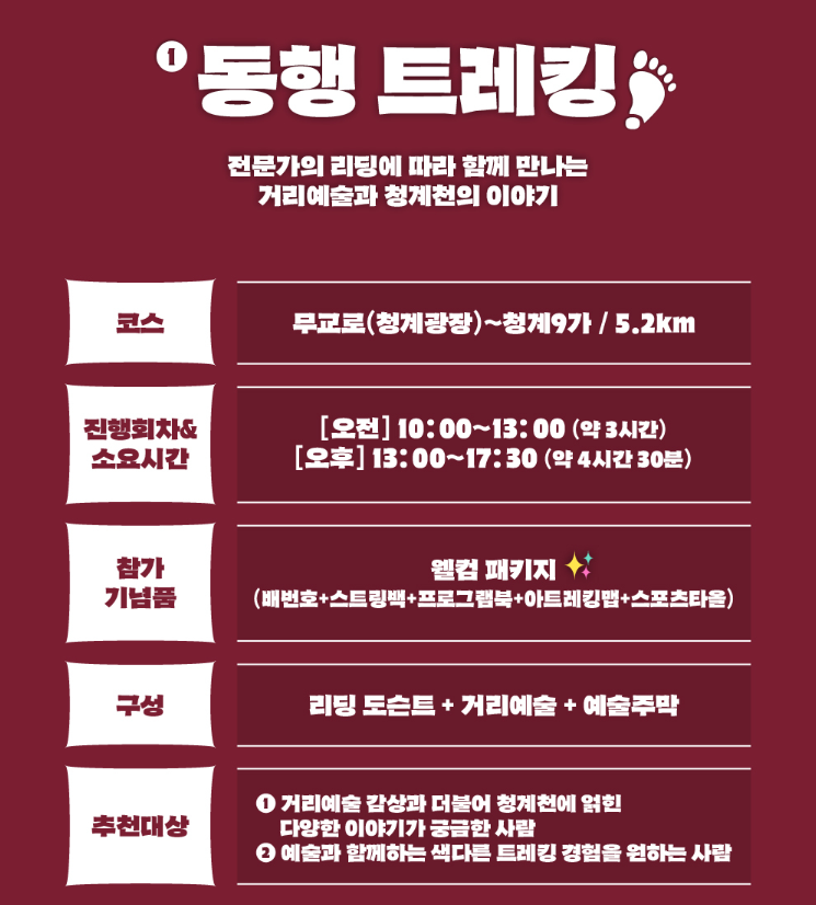 | 동행 트레킹 | 오전 10:00~13:00 / 오후 13:00~17:30 | 전문가 리딩, 거리예술+예술주막 체험 |