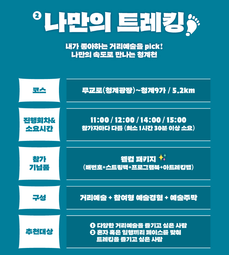 | 나만의 트레킹 | 11시, 12시, 14시, 15시 | 자율 속도, 참여형 예술 체험 가능 |