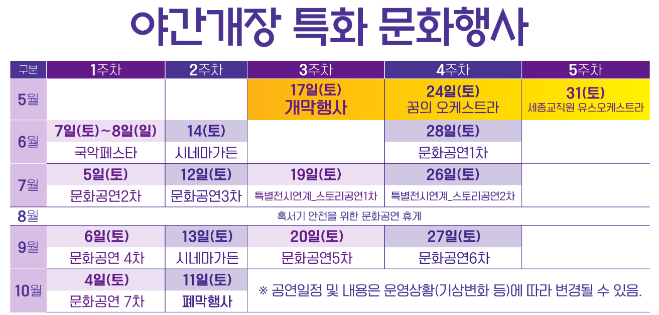 매주 다양한 테마의 공연이 펼쳐집니다. 오케스트라, 국악, 시네마 가든 등 다채로운 공연을 통해 여름밤의 정취를 느껴보세요.