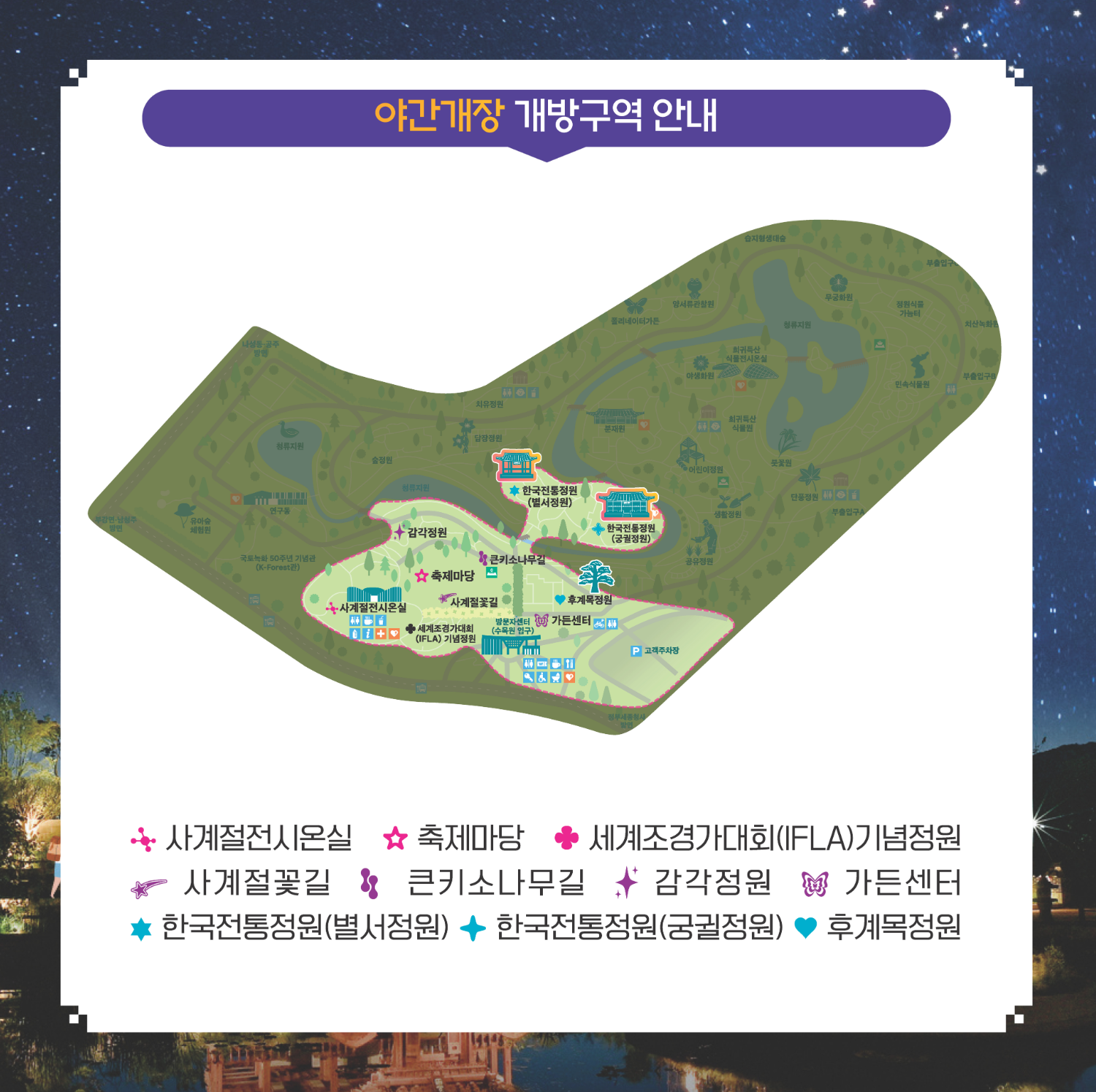 낮과는 또 다른 매력을 지닌 수목원의 야경과 함께 다양한 문화 프로그램을 즐겨보세요.