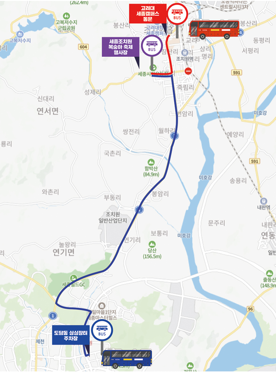 - 1노선: 고려대학교 동문주차장 ↔행사장 / 소요시간 15분 / 배차간격 30분 / 첫차시간 10:00 (27일09:20)