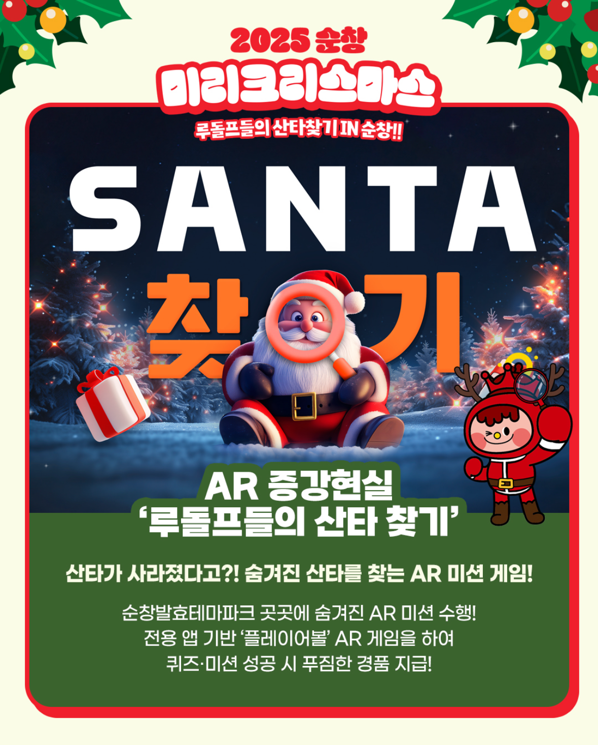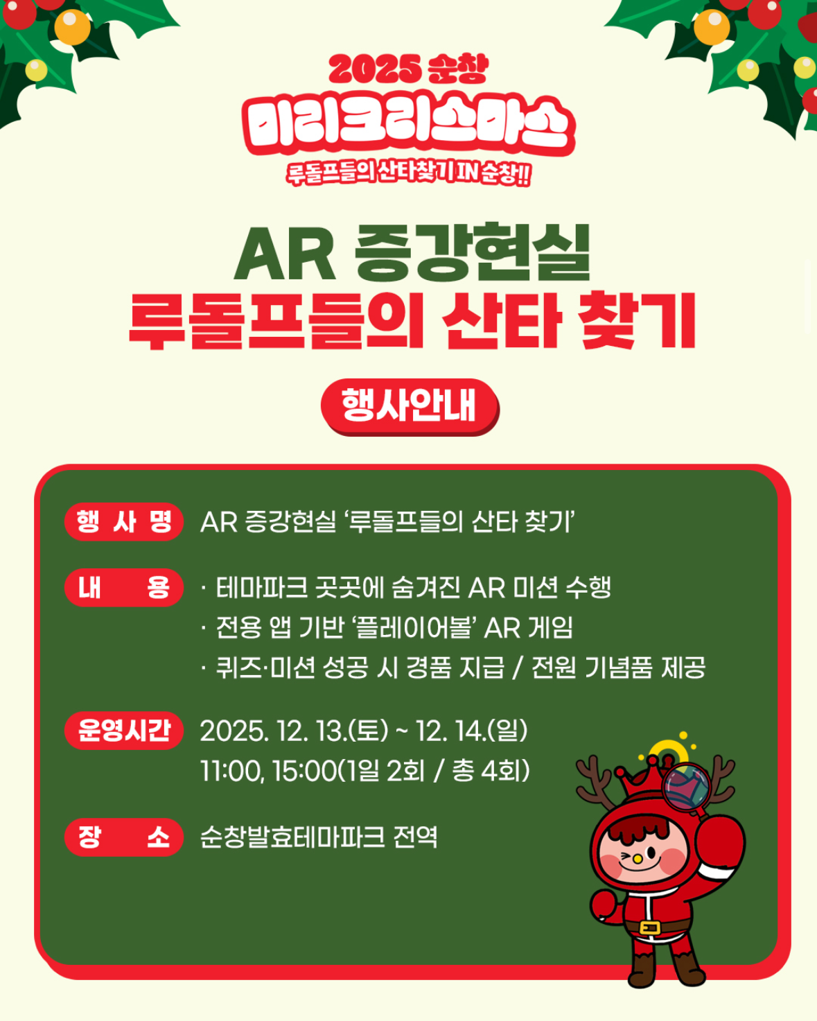 | 🎅 AR 증강현실 – 루돌프들의 산타 찾기 | AR 미션 게임, 퀴즈 성공 시 선물 증정 | 11:00 / 15:00 (1일 2회) | 순창발효테마파크 전역 | 아이 인기 1위 프로그램 |
