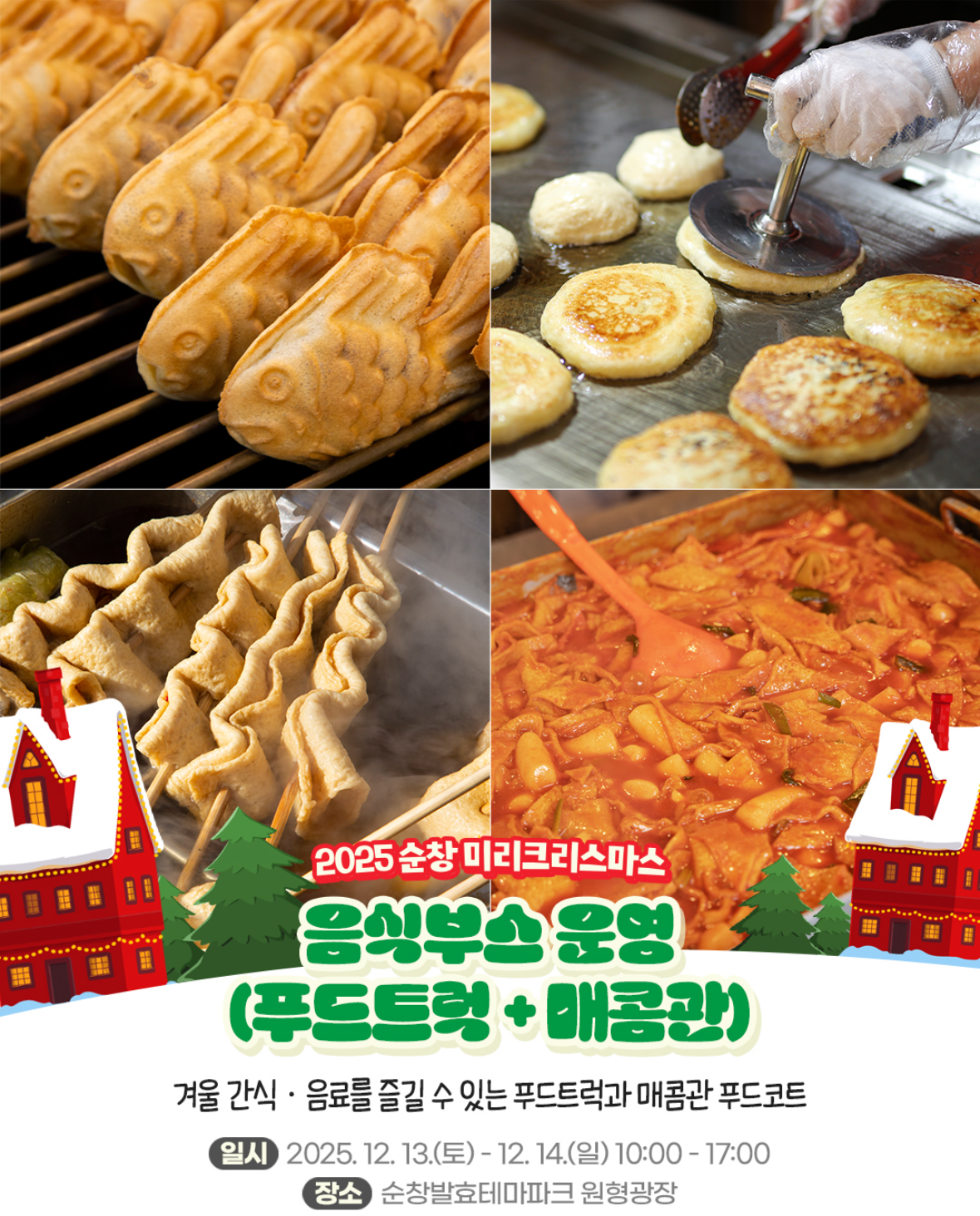 | 🌭 푸드트럭 & 매콤관 푸드코트 | 겨울 간식·음료 | 10:00~17:00 | 일대 | 꼬치·호떡·군고구마 |
