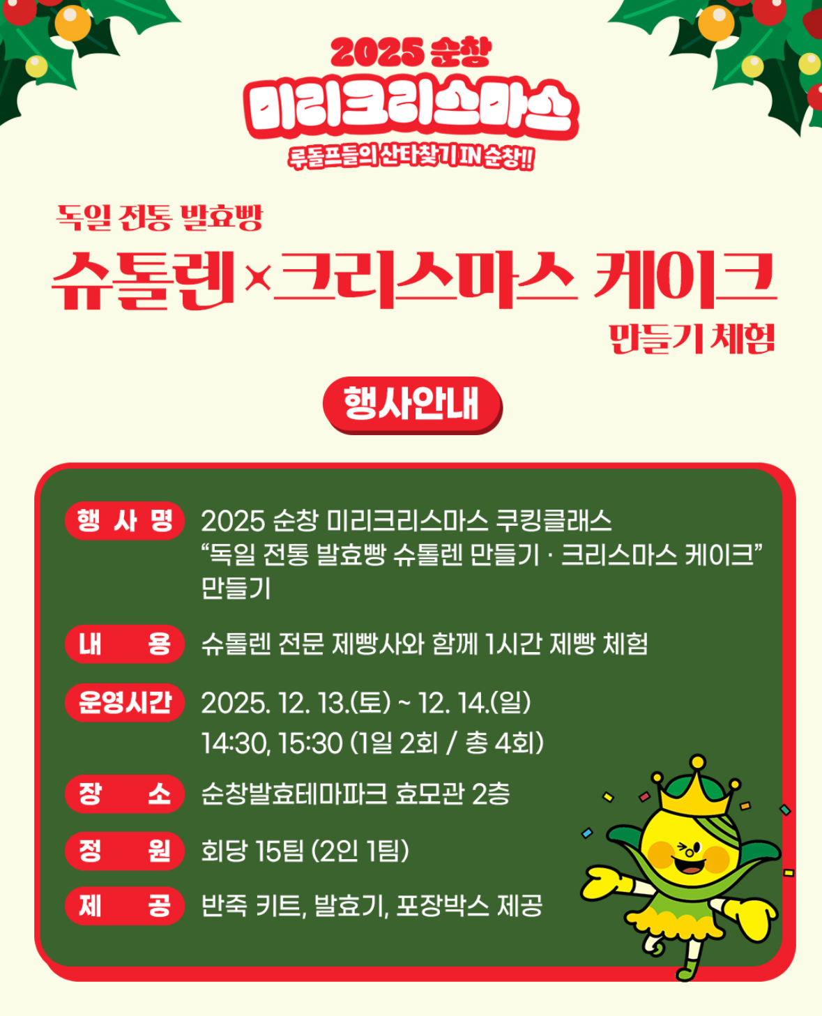 | 🍞 독일 발효빵 슈톨렌 × 크리스마스 케이크 만들기 | 전문 제빵사와 1시간 베이킹 클래스 | 14:30 / 15:30 | 효모관 2층 | 2인 1팀 / 반죽·발효·포장 제공 |