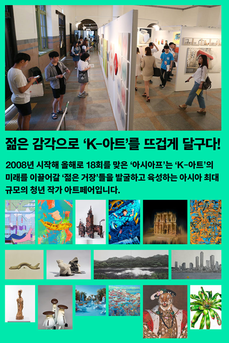 2008년 시작해 올해로 18회를 맞는 아시아프는 'K-아트'의 미래를 이끌어갈 젊은 거장들을 발굴하고 육성하는 아시아 최대 규모의 청년 작가 아트페어입니다.