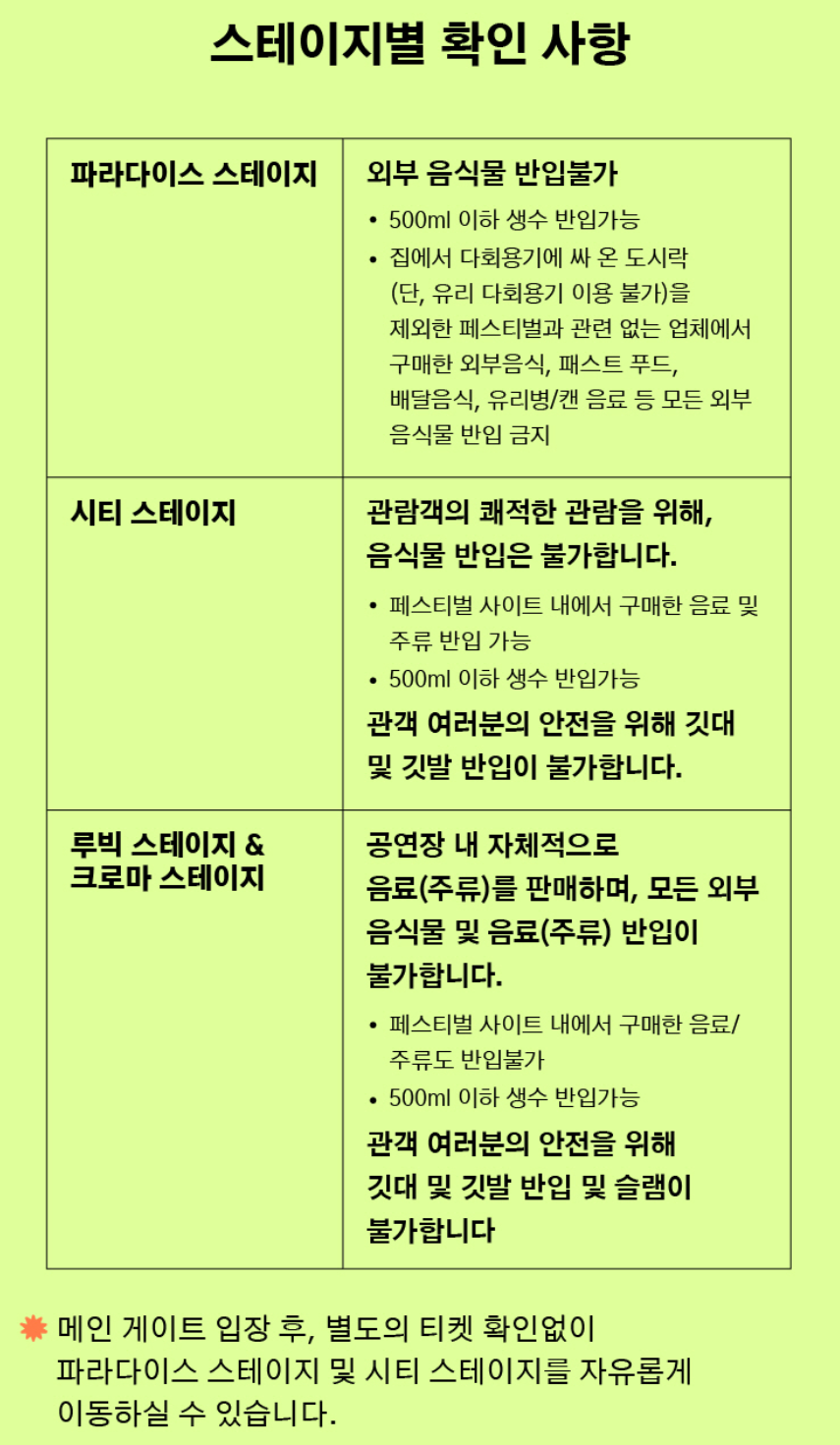 - 관람 등급: 전 연령 관람 가능 (일부 스테이지 미성년자 입장 불가)