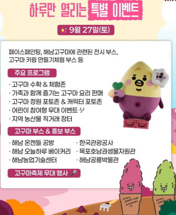 “고구마 수확 체험부터 먹거리 장터, 가족 포토존까지” 아이부터 어른까지 모두가 즐길 수 있는 2025 해남 고구마 정원 축제 소식을 전해드립니다.