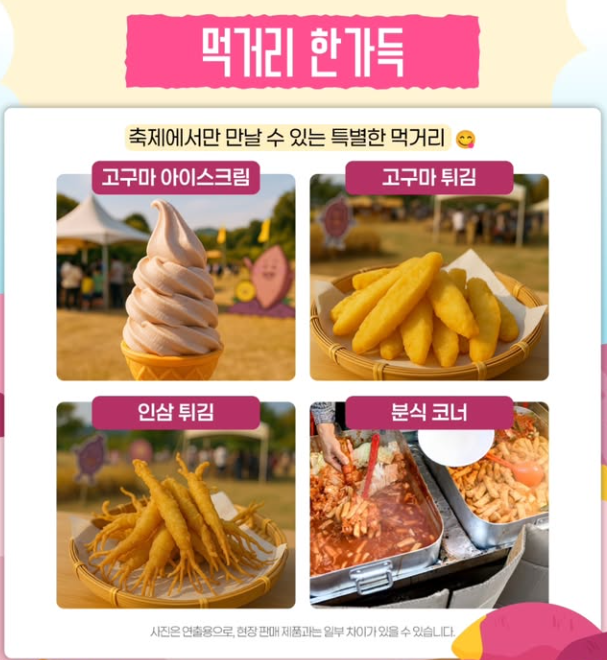 - 고구마 수확&체험존, 고구마 요리 판매, 고구마정원 포토존&캐릭터포토존, 어린이 참여형 무대이벤트, 지역 농산물 직거래 장터